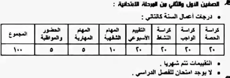 وبناء على القرار الوزاري 136 لسنة 2024 والخاص بنظام الدراسة والتقييم لتلاميذ المرحلة البدائية، تطبق المادة الرابعة لنظام التقييم بالصفين الأول والثاني الابتدائي، ويقوم نظام التقييم على قياس الأداء والسلوك الفردي والجماعي للتلاميذ عن طريق المهام الفردية الجماعية بأنواعها التحريرية والشفهية والمهارية.