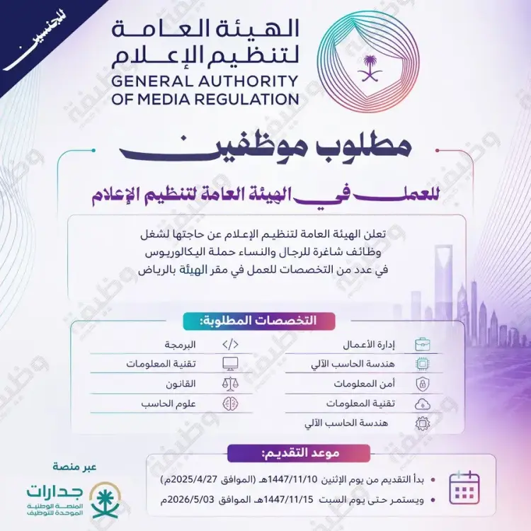 ويتم استقبال طلبات التوظيف عبر المنصة الوطنية الموحدة للتوظيف «جدارات»، مستهدفة كوادر وطنية متخصصة في مجالات تقنية وإدارية وقانونية لتعزيز منظومتها الرقابية والتمكينية في قطاع الإعلام السعودي.