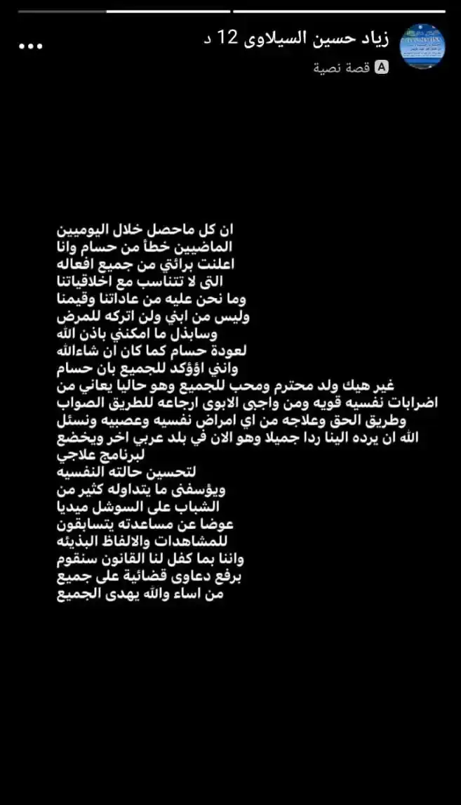 لكن الأب عاد وغيّر موقفه لاحقا، مؤكدا أن ما صدر عن ابنه كان نتيجة ظروف نفسية صعبة، موضحا أنه يخضع حاليًا لبرنامج علاجي خارج البلاد، مع أمله في استعادة استقراره النفسي.
