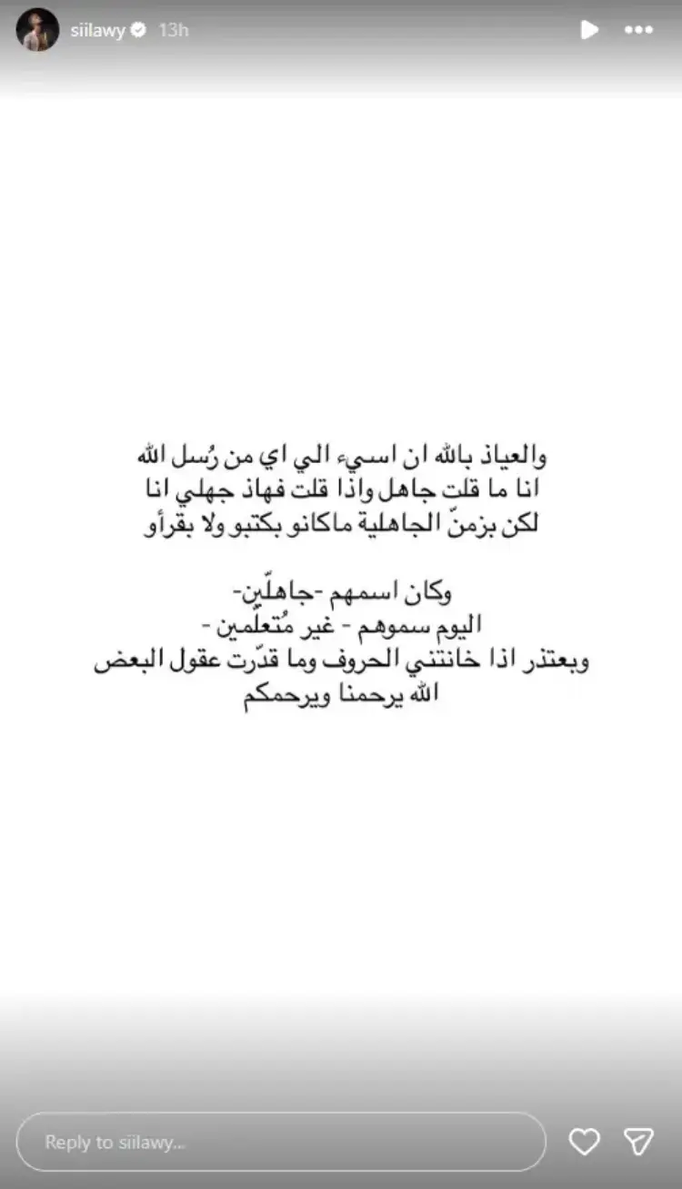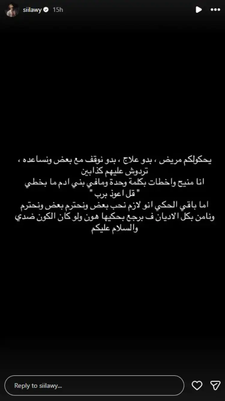 وفي منشور لاحق، خرج السيلاوي بتوضيح للدفاع عن نفسه، مؤكدًا أن ما يتم تداوله حول حالته الصحية “غير صحيح”، وقال: «يقولون عني مريض ويحتاج علاجًا.. لا تصدقوهم، أنا بخير، وأخطأت بكلمة واحدة، ولا يوجد إنسان لا يخطئ».