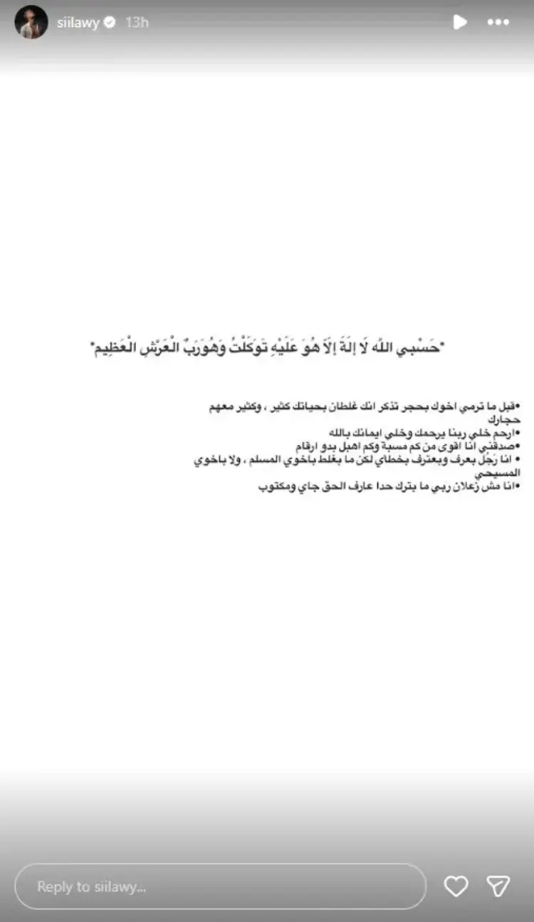 في أول ظهور له بعد تفجر الأزمة، لجأ الفنان الأردني حسام السيلاوي إلى حساباته على مواقع التواصل الاجتماعي، حيث نشر آية من القرآن الكريم، وأرفقها بتعليق مقتضب قال فيه: “الحمد لله.. حسبي الله ونعم الوكيل”، في إشارة فُهمت على نطاق واسع على أنها رد غير مباشر على الجدل المثار حوله.