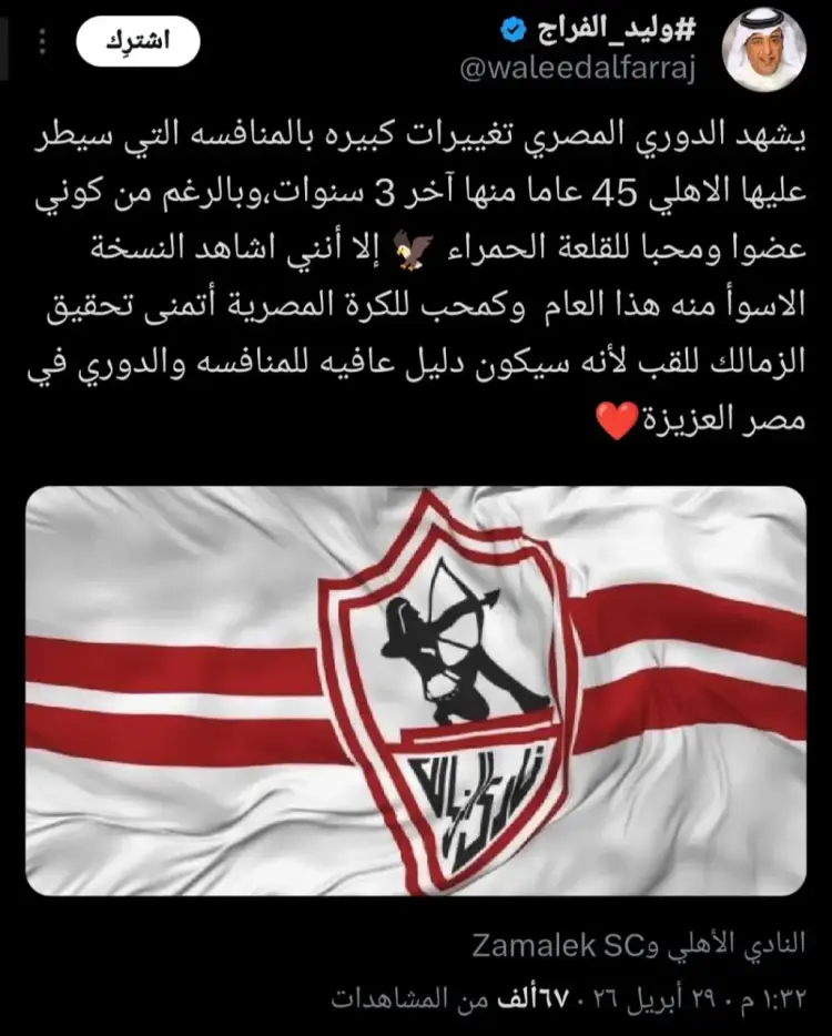 ونشر وليد الفراج عبر حسابه الرسمي على منصة «إكس» تدوينة أكد فيها أن الدوري المصري يمر بمنعطفات تاريخية في طبيعة الصراع على الدرع الذي هيمن عليه الأهلي لعقود طويلة، مشيرا إلى أنه رغم عضويته ومحبته للقلعة الحمراء، إلا أن المستوى الفني المقدم حاليا لا يرتقي لتاريخ النادي العريق.