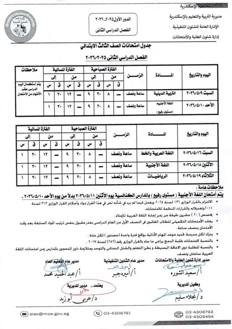 جدول امتحانات الصف الثالث الابتدائي الترم الثاني محافظة الإسكندرية 2026