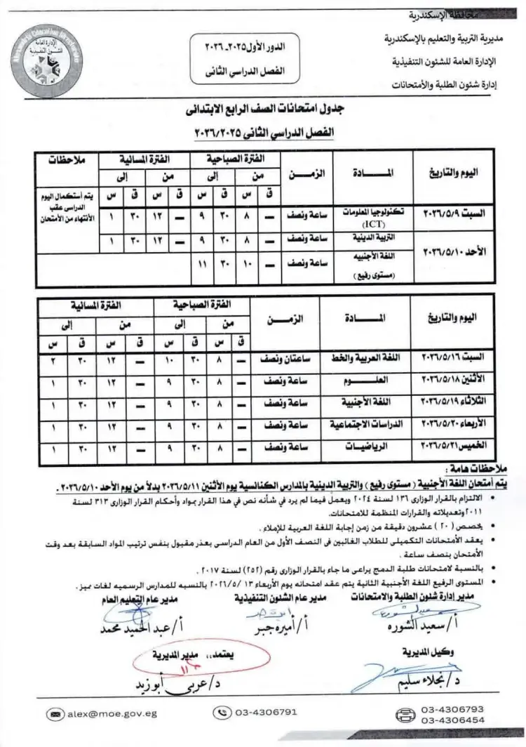 جدول امتحانات الترم الثاني رابعة ابتدائي محافظة الإسكندرية