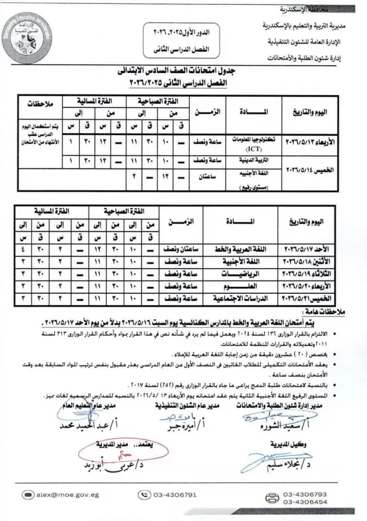 جدول امتحانات الصف السادس الابتدائي الترم الثاني محافظة الإسكندرية 2026