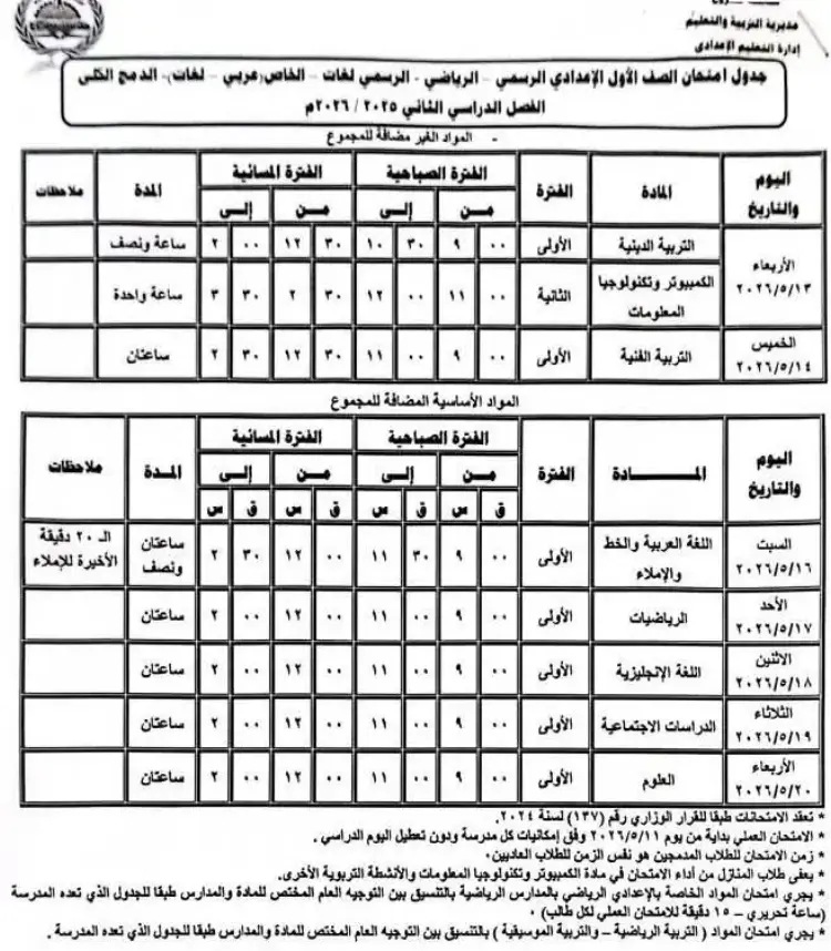 اعتمدت مديرية التربية والتعليم بمحافظة مطروح الجداول الرسمية المنظمة لاختبارات نهاية العام الدراسي، حيث تضمنت الوثائق التفصيلية جدول امتحانات الصفين الأول والثاني الإعدادي الفصل الدراسي الثاني محافظة مطروح بما يضمن سير العملية التعليمية وفقا للقواعد الوزارية المتبعة، مع التأكيد على توفير المناخ الملائم للطلاب داخل اللجان بجميع الإدارات التعليمية التابعة للمحافظة.