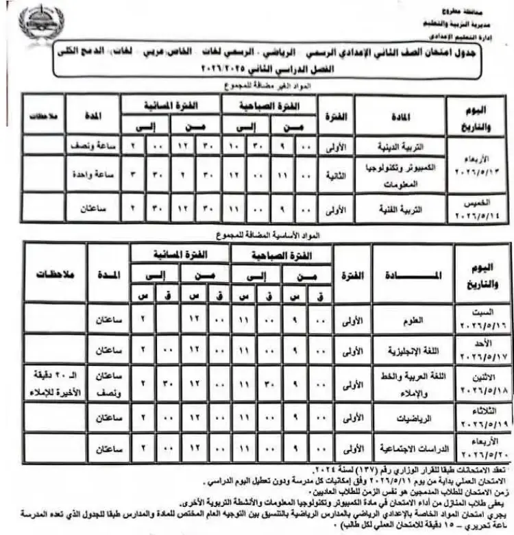 جدول امتحانات الصفين الأول والثاني الإعدادي محافظة مطروح الترم الثاني 2026
