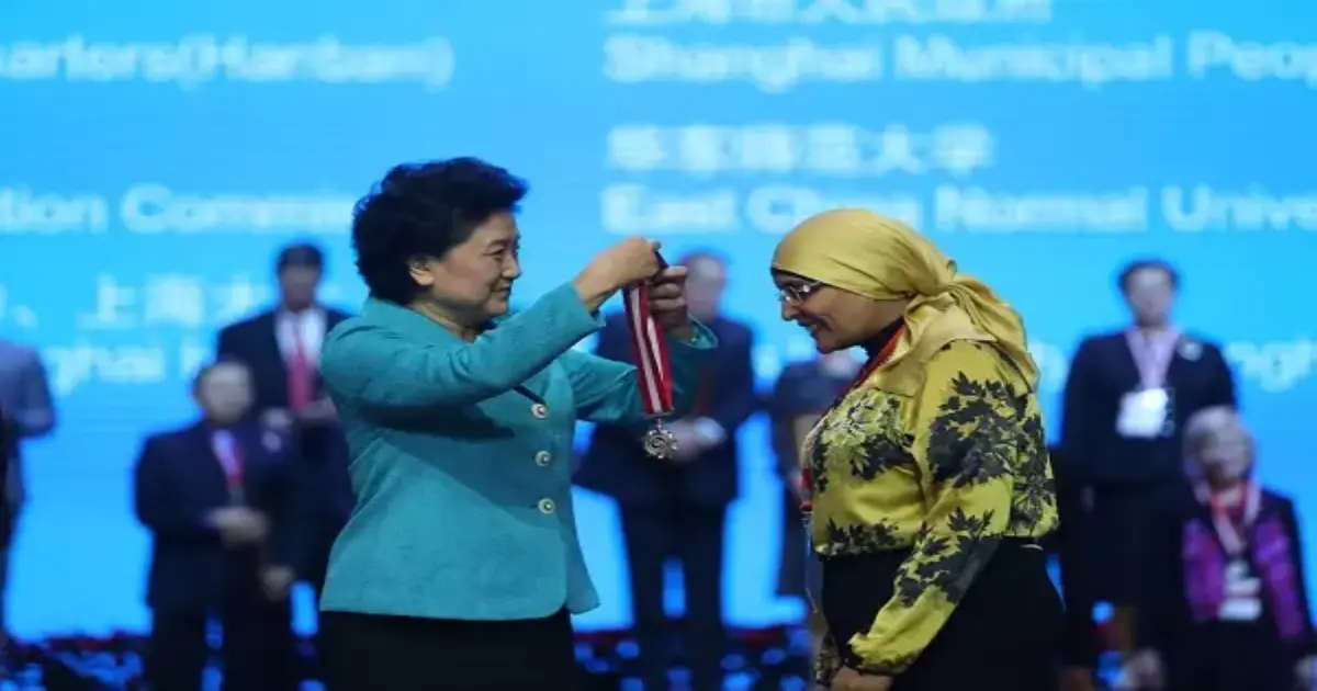 وسلمت نائب رئيس مجلس الدولة الصيني، ليو يان دونغ، الجائزة للدكتورة رحاب خلال مشاركتها خلال مشاركتها في المؤتمر الدولي لمعاهد كونفشيوس حول العالم في مدينة «شنغهاي».