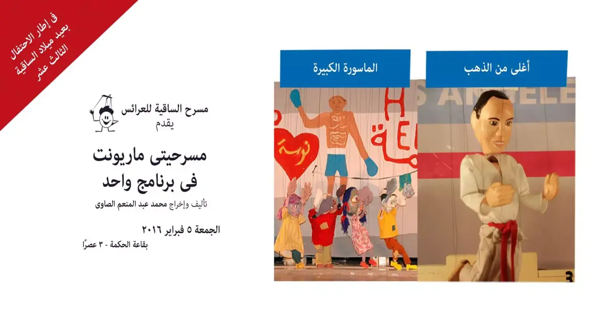 تقيم ساقية الصاوي اليوم الخميس، مسرح عرائس ماريوونيت، في الساعة الثالثة عصرا، بقاعة الحكمة. وتقدم الساقية مسرحيتي ماريونيت في برنامج واحد، وهما «أغلى من الذهب» و«الماسورة الكبيرة» وسعر التذكرة 15 جنيها. ويأتي العرض في إطار الاحتفال بعيد ميلاد اسلاقية الثالث عشر. والمسرحيتان من إخراج وتأليف محمد عبد المنعم الصاوي.