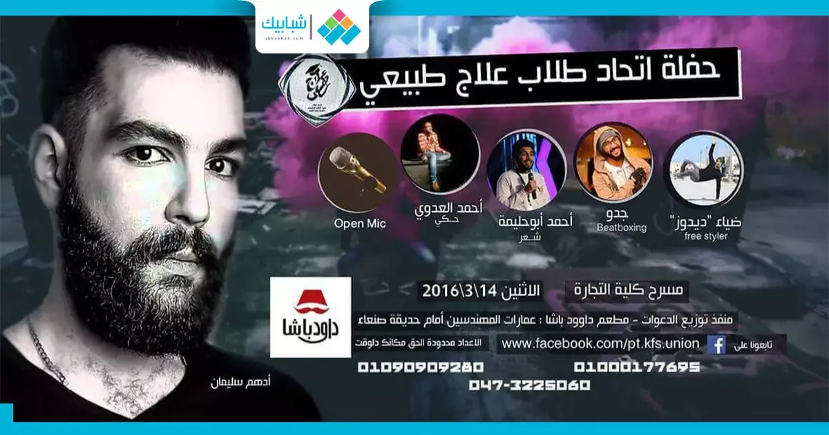 ينظم اتحاد طلاب كلية العلاج الطبيعي بجامعة كفرالشيخ، حفل غنائي الإثنين القادم الموافق 14مارس الجاري، على مسرح كلية التجارة بالجامعة.