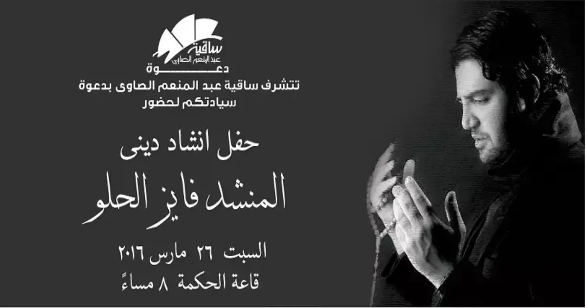تقيم ساقية الصاوي اليوم السبت حفل إنشاد ديني للمنشد السوري «فايز الحلو» وذلك في الساعة الثامنة مساء بقاعة الحكمة.