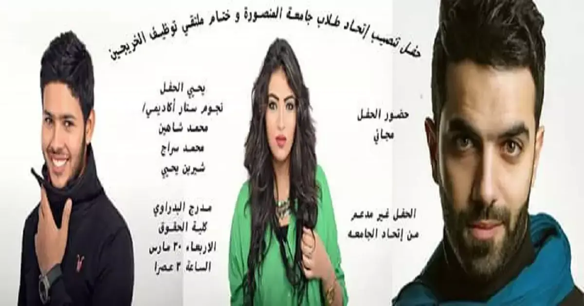 يحيي الحفل نجوم برنامج ستار أكاديمي، محمد شاهين وشيرين يحي ومحمد سراج، بحضور طلاب جامعة المنصورة وعدد من اعضاء هيئة التدريس.