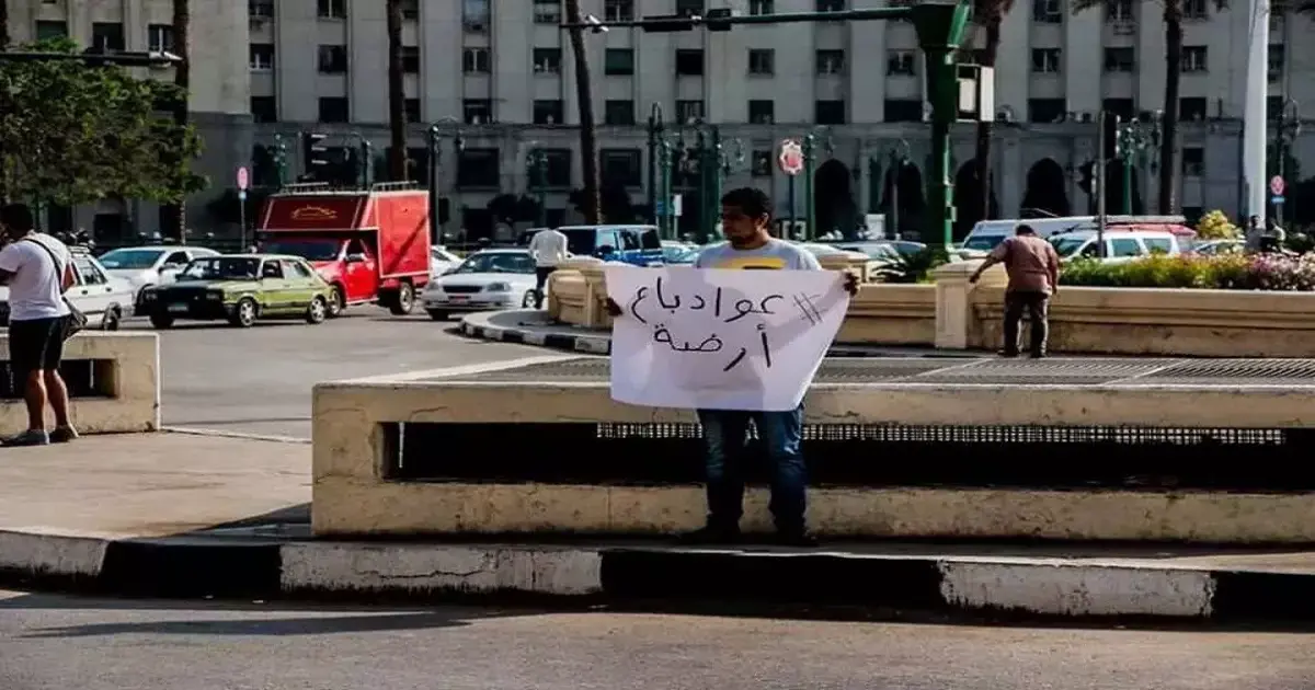 «عواد باع أرضه».. لافتة شاب يتظاهر وحيدا بميدان التحرير