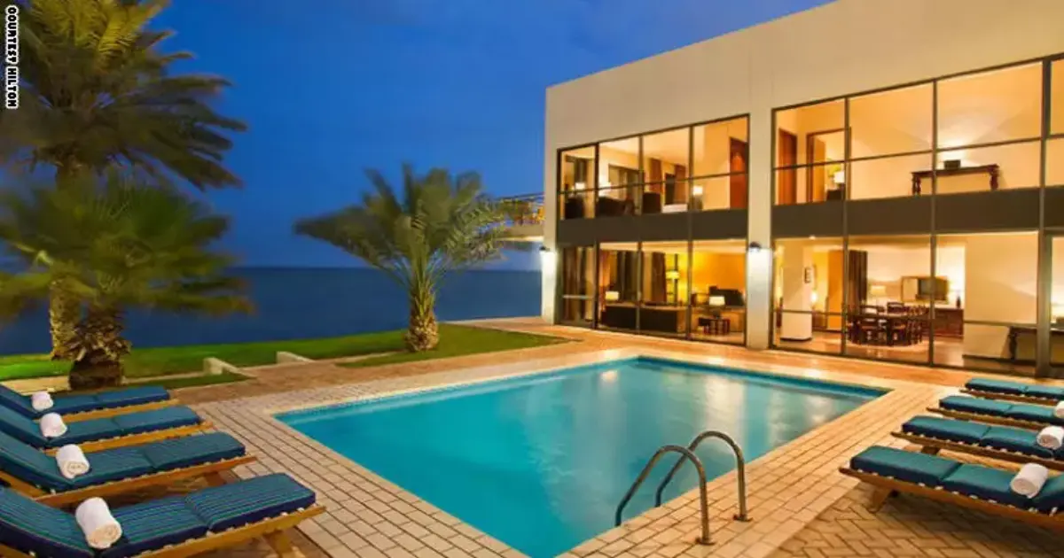 الفيلا الملكية في فندق هيلتون الكويت: على ضفاف شاطئ المنقف جنوب مدينة الكويت، تقع الفيلا الملكية، بمساحة 651 متر مربع. ومقابل 1640 دولار في الليلة، يمكن الاستمتاع بهذا الجناح، بشاطئ وبركة سباحة خاصة.