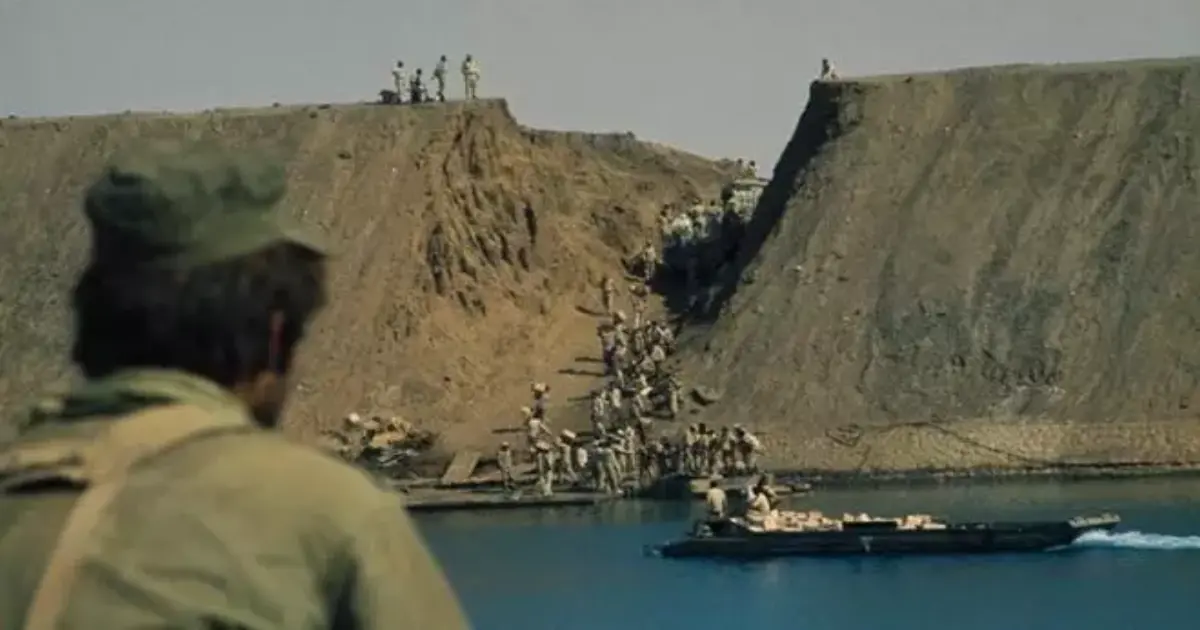 سرعان ما يحمل جند المشاة تلك الزوارق المطاطية ويحولون لون المياه الأزرق إلى رملي بلون زيهم العسكري، تنهال قذائف المحتل فتصيب من أصابت وتمزق من مزقت، ها هم على الضفة الشرقية وبدأوا بالفعل في تسلق الساتر الترابي، صعد ذاك الشاب فوقه ممزقًا العلم الإسرائيلي ويستبدله بالمصري قبل أن يتلقى رصاصة في صدره ليسقط متكئًا على الساري، وينتقل المشهد إلى داخل تلك الطائرة التي عُرفت بطائرة قائد الضربة الجوية «حسني مبارك».
