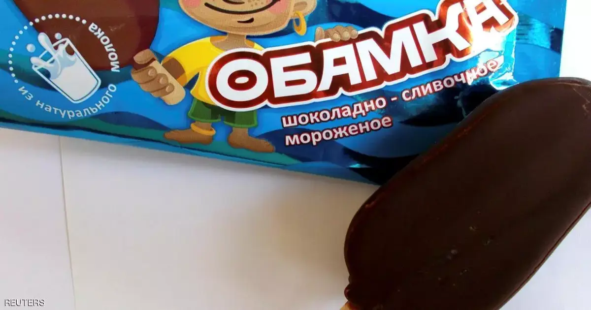 فالمنتج المزين بالشيكولاتة والمسمى باللغة الروسية «أوبامكا»، تظهر على غلافه صورة فتى أفريقي مبتسم يضع قرطًا في أذنه ويمسك بالأيس كريم.