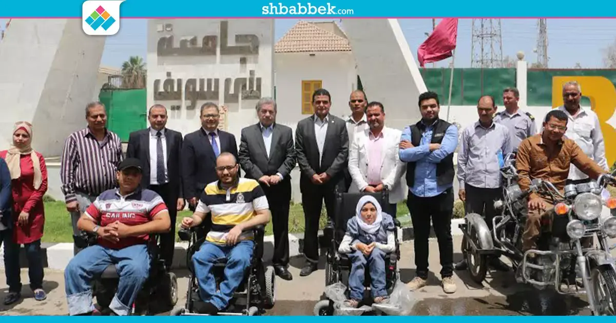 سلم رئيس جامعة بني سويف، الدكتور أمين لطفي، اليوم الأحد، دراجة بخارية مجهزة وكرسيين كهربائيين لثلاثة طلاب من ذوي الاحتياجات الخاصة بالجامعة.