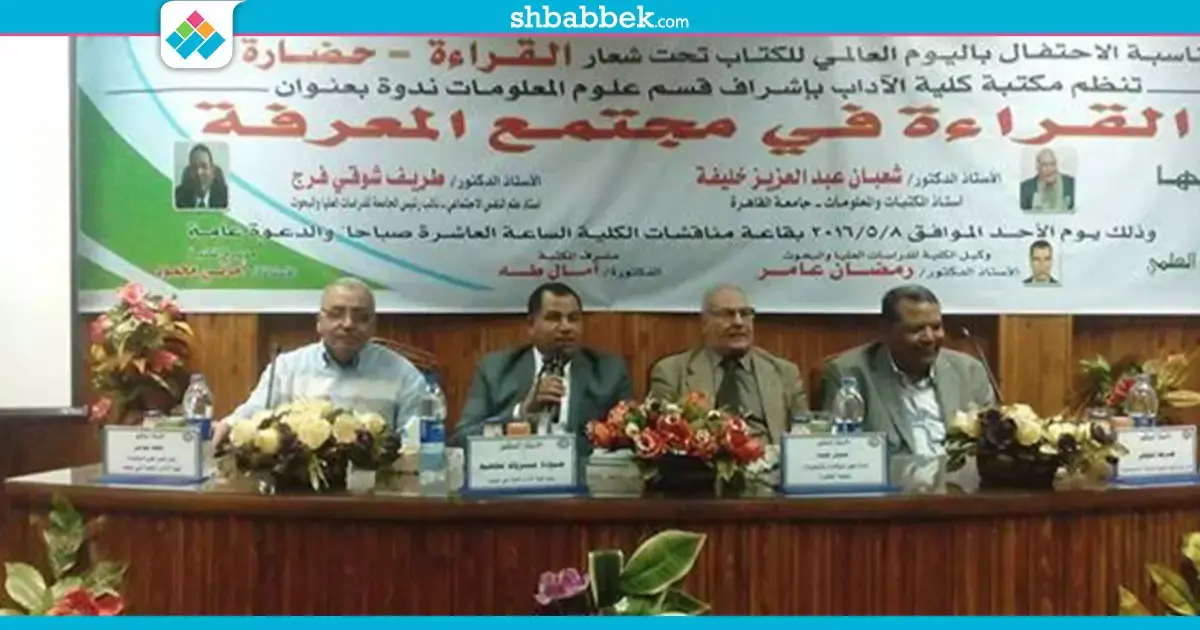 نظمت كلية الآداب جامعة بني سويف، اليوم الإثنين، ندوة بعنوان «القراءة في مجتمع المعرفة»، بمناسبة الاحتفال باليوم العالمي للكتاب تحت شعار «القراءة تساوي حضارة»، بحضور نائب رئيس الجامعة لشئون الدراسات العليا والبحوث، الدكتور طريف شوقي، وعميد الكلية الدكتور جودة مبروك، وأستاذ المكتبات والمعلومات بجامعة القاهرة، الدكتور شعبان خليفة.