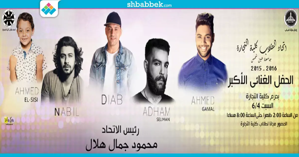 أعلن اتحاد طلاب كلية التجارة بجامعة عين شمس، عن إقامة حفل في نهاية العام الدراسي الحالي وأنشطتة، وذلك بحفل غنائي، يوم السبت القادم، الموافق 4 يونيو الجاري، في تمام الثانية ظهرًا وحتى الثامنة مساءً، بحرم الجامعة وذلك بعد غياب الحفلات الغنائية بالجامعة زيادة عن ست سنوات.