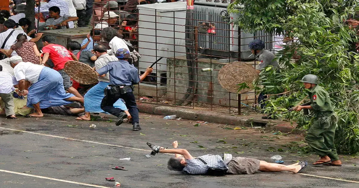 في 2007 التقط مصور رويترز صورة لتفريق مظاهرة ضد العسكريين في ميانمار . وخلالها أطلق الجنود النار وقتلوا رجلا مستلقيا على ظهره.