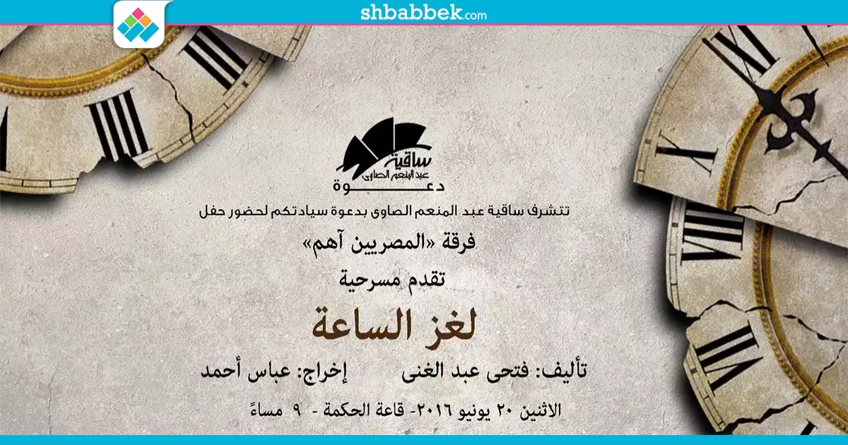 تعرض ساقية الصاوي اليوم الاثنين مسرحية «لغز الساعة» وذلك في الساعة التاسعة مساء، بقاعة الحكمة.