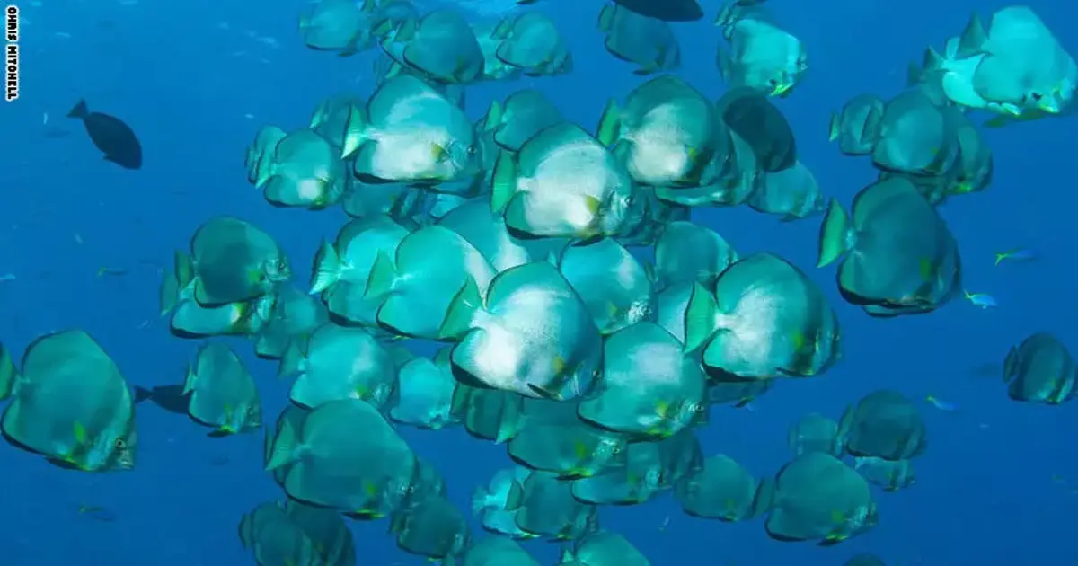 تتجمع الأسماك حول الشعب المرجانية الكبيرة التي تشبه الفطر والتي ينمو تحتها الإسفنج الكبير.