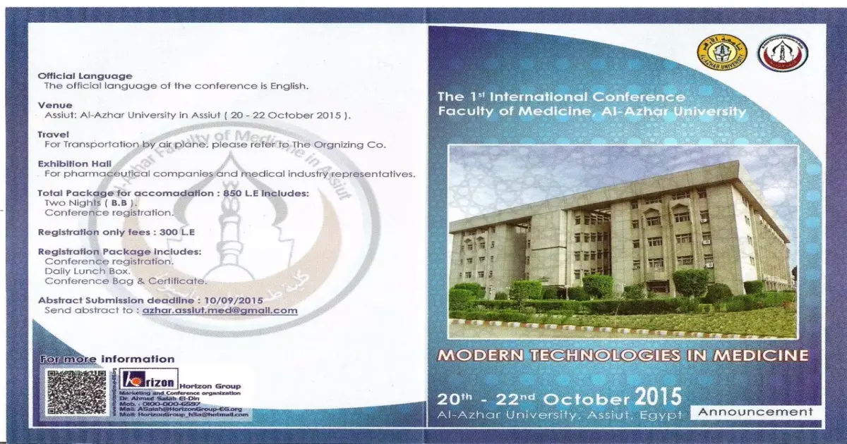 تنظم جامعة الأزهر مؤتمرًا بكلية الطب البشري فرع أسيوط، تحت عنوان « التكنولوجيا الحديثة في مجالات الطب المختلفة»، وذلك يوم الثلاثاء 20 أكتوبر بمقر الكلية بأسيوط. يشار إلى أن الكلية أغلقت باب التقدم بالملخصات والأبحاث العلمية التى قدمها الباحثون التي ستعرض فى المؤتمر، سبتمبر الماضي.