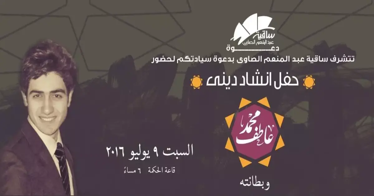 تقيم ساقية الصاوي اليوم السبت حفلًا للمنشد الديني «محمد عاطف» وذلك في الساعة السادسة مساء بقاعة الحكمة. و«محمد عاطف» هو منشد ديني عرف ببراعته وصوته العذب في آداء الابتهالات الدينية وحفظ القرآن الكريم منذ طفولته. ولمزيد من المعلومات والحجز اضغط «هنا» «كتاب الله»لـ«محمد عاطف»