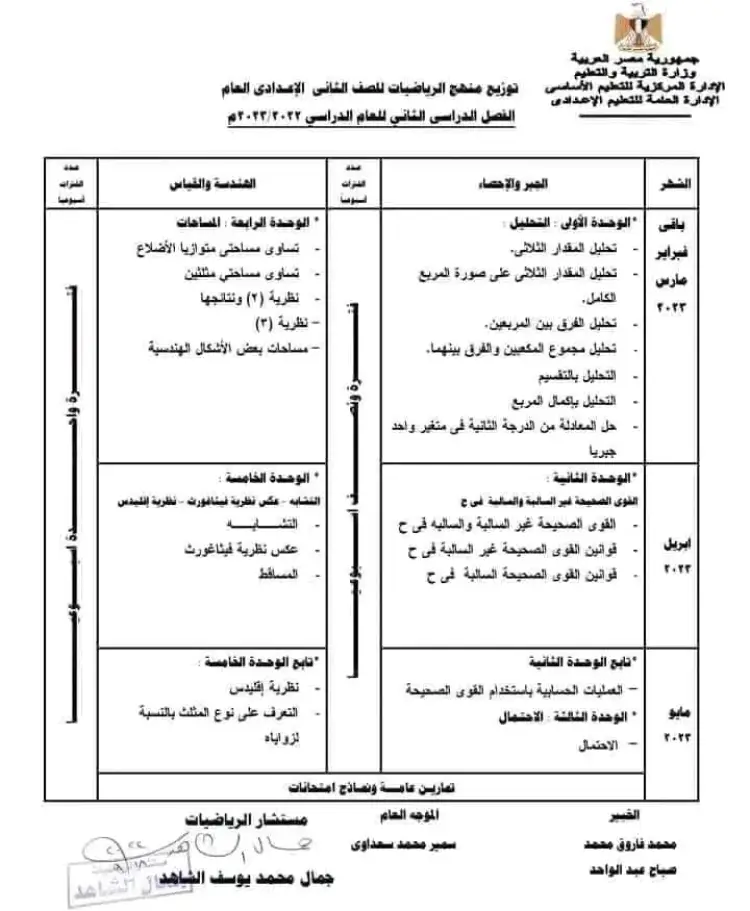 أعلنت الإدارة العامة للتعليم الإعدادي التابعة لوزارة التربية والتعليم والتعليم الفني عن توزيع منهج الرياضيات للصف الأول والثاني الإعدادي ترم ثاني 2023.